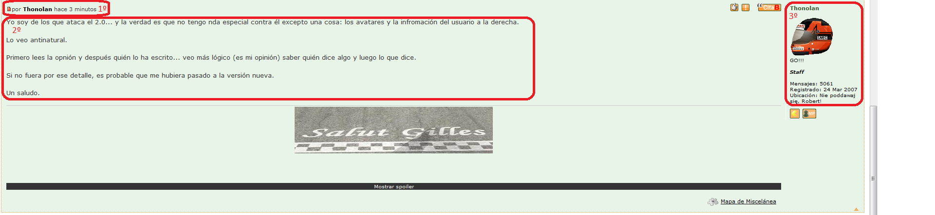 Los puntos 1 y 3 que señalas quedan juntos y te ahorras tner que bvolver a mirar quién es el usuario (yo, por lo menos, no me fijo casi nunca en el punto 1 que señalas, a no ser que quiera ver la hora y la fecha a la que posteó el mensaje... y eso se puede hacer igualo incluso mejor, con la versión anterior)
