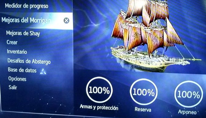 En cuanto a las mejoras de Shay, he conseguido el 83% de espadas (me faltó el sable de caza, que se obtiene al completar todas las búsquedas de caza; la espada de Altaïr, que se obtiene en una ubicación especial después de completar todas las misiones de la flota; y la catana, canjeable en Uplay). El 70% de pistolas (me faltó la pistola de llave de chispa india que se consigue al completar la misión de flota de Yanaon; y la pistola de Edward, canjeable en Uplay). Y el 80% de atuendos (me faltó el de matón templario, que se desbloquea al completr todas las interceptaciones de asesinos; el de maestro templario, que se obtiene al completar todas las batallas legendarias; el de almirante, que se consigue al completar la misión de la flota de Malacca; y el de sicario, cajeable en Uplay).