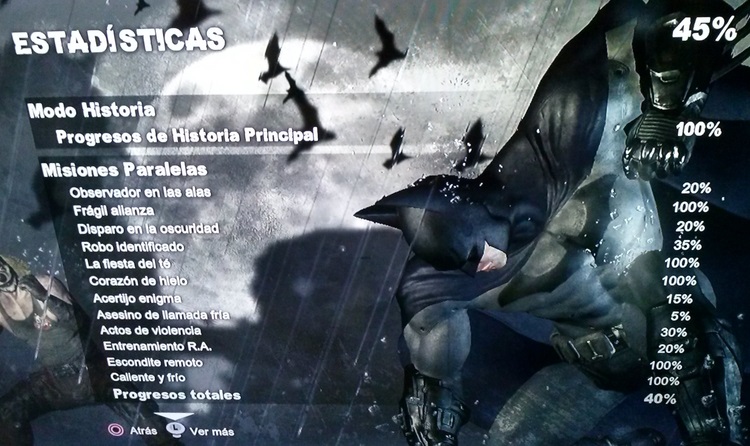 Nilin escribió:Después de 8 horas (en este caso, creo que es la única entrega que incluye información del tiempo jugado), ayer se me dio por mirar el progreso que llevaba en Batman Origins y, a pesar de que la historia principal estaba al 51%, el progreso general del juego estaba en el 15%; lo que demuestra que tanto Batman Arkham City como Origins, están infladísimos con chorraditas variopintas en forma de misiones secundarias, coleccionables y desafíos con el único fin de estirar el juego innecesariamente. Y digo innecesariamente porque Batman Asylum no tiene semejante cantidad de añadidos y precisamente por ello es un juego fresco y distinto a los juegos tradicionales, ya que todo está más equilibrado, dándole mayor relevancia a la historia principal.