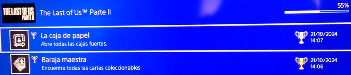 He seguido jugando en el modo Nueva Partida+ a TLOU2 hasta completar Seattle, día 2 (Ellie), que ha sido cuando me han saltado los trofeos Baraja maestra (encontrar todas las cartas) y La caja de papel (encontrar todas las cajas fuertes), alcanzando el 55%
