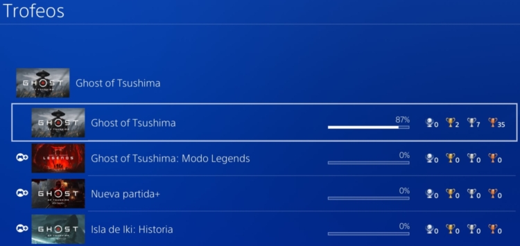 En mi caso, he conseguido el 87% de los trofeos del juego; pero como hacen media con el resto de trofeos (los del DLC, los de nueva partida+ y los online), en el porcentaje general aparece el 55%, así que de momento lo dejaré así.Ghost of Tsushima_Trofeos_87%.jpg (94.27 KB)