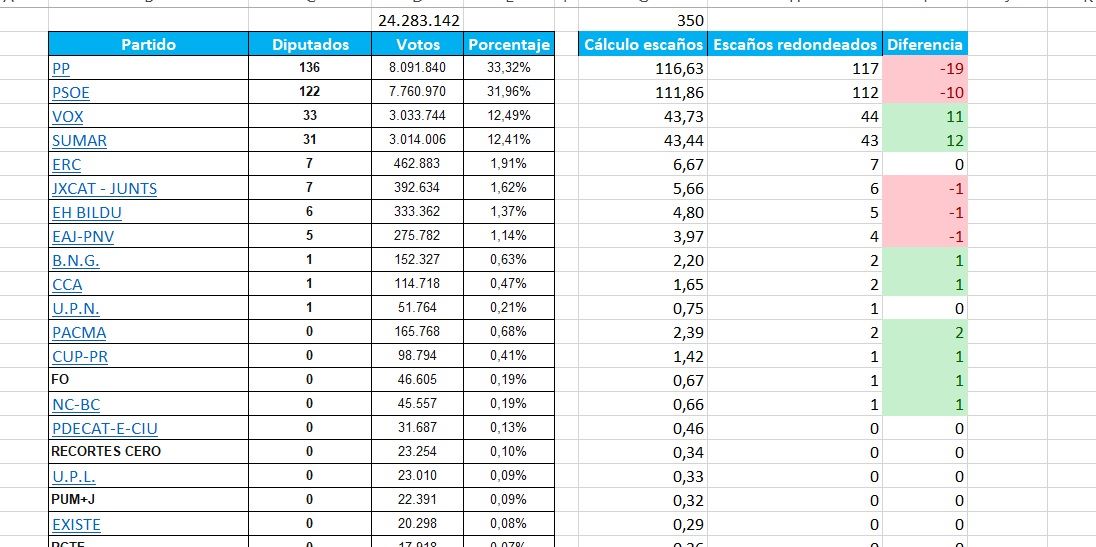 Primero: sí, PSOE y PP tendrían menos diputados... pero Sumar y Vox ganarían diputados más o menos en la misma medida. Los dos grandes bloques serían muy parecidos a los de hoy, con diferencias mínimas de 2-3 diputados arriba o abajo.