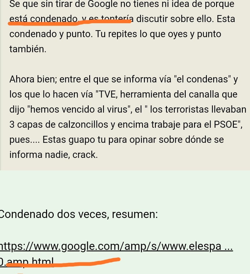Ahora bien; entre el que se informa vía "el condenas" y los que lo hacen vía "TVE, herramienta del canalla que dijo "hemos vencido al virus", el " los terroristas llevaban 3 capas de calzoncillos y encima trabaje para el PSOE", pues.... Estas guapo tu para opinar sobre dónde se informa nadie, crack.