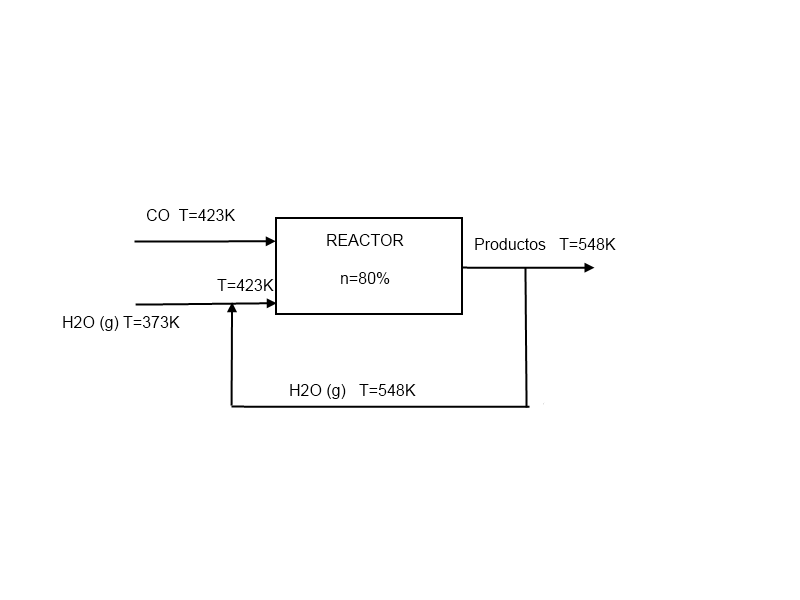 que se desarolla en un lecho catalítico refrigerado a presión atmosférica. Los reaccionantes se alimentan al reactor a 423K y los productos lo abandonan a 548K. A fin de conseguir una conversión elevada (80% del CO), se utiliza vapor de agua en exceso, mezclando el vapor que no ha reaccionado con vapor de agua proveniente de una caldera tal y como se indica en el esquema. Calcular: