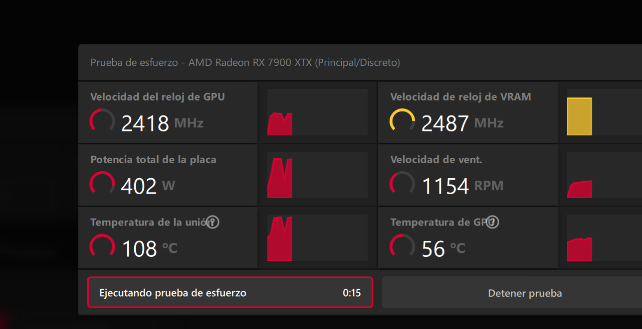 Ufaneitor escribió:Hola, probando la aorus 7900xtx comprada en la oferta de pccomponentes, sin tocar nada haciendo la prueba de rendimiento de adrenalin se pone a 108 ºC a los 10 segundos.. veis eso normal??adreanlin.png