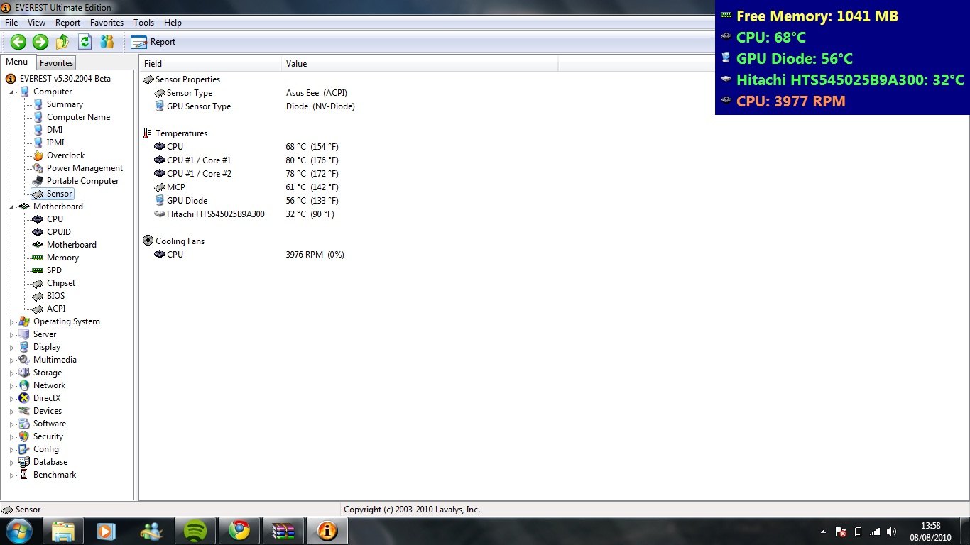 Por otra parte hay gente que se mueve en los 65 grados de media....lo cual sigue siendo demasiado pero ya es algo mejor.Lo que me mosqueo fue ver que esa gente tenga mediciones de 3800 RPM para el ventilador, cuando a mi el everest me da 580 (el speedfan no me detecta nada, directamente).