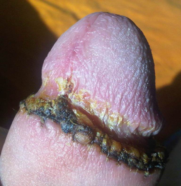 Me incorporo un poco (cuidado aquí que os podeis marear) y veo mi pene entre un mar de betadine, y como el doctor me dice "antes lo tenias así" y cogia y unía con sus dedos el frenillo que acababa de cortar, "y ahora lo tienes asi" y me descapullaba el glande y pude ver como el frenillo ya no estaba, y casi que no había ni herida!, le pregunte si no cogía puntos y me contesta que con el bisturí electrico (eso es el zumbido que escuché), la herida se va cauterizando a la vez que la va haciendo.