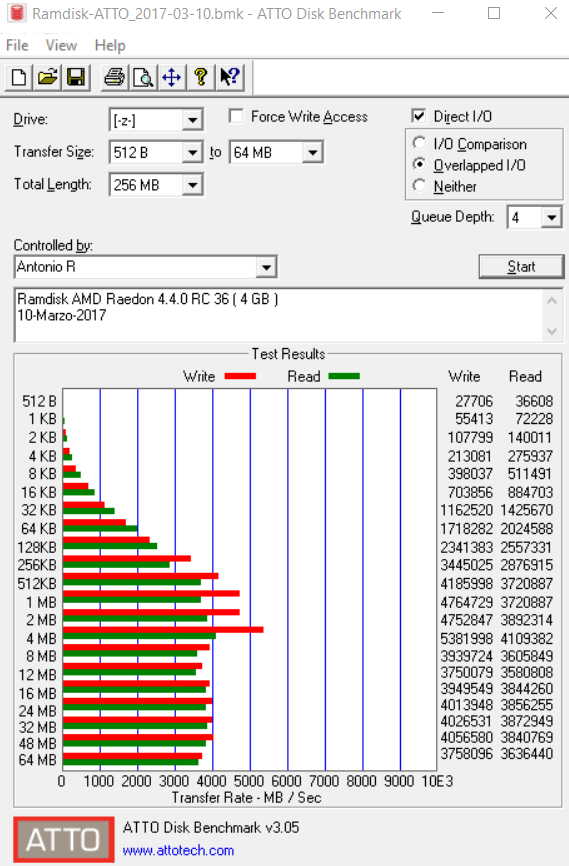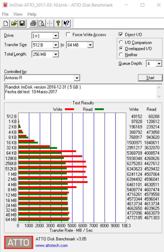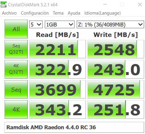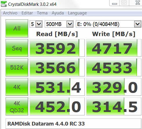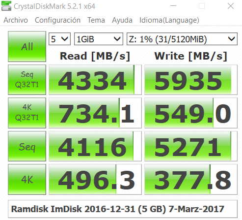 Te adjunto un test de rendimiento de mi ramdisk como veras no tiene comparacion con ningun SSD SATA