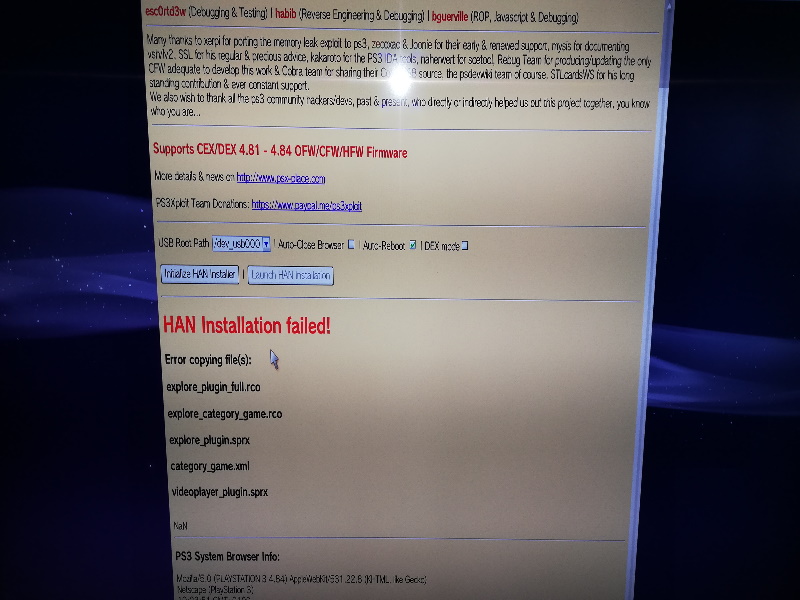 Yo soy muy nuevo con estas cosas de ps3 porque es de un amigo. Ese tutorial ya me lo habia visto pero siempre me error al ejecutar Han (Launch HAN Installation), lo he intentado varias veces desde cero pero tampoco ha habido otro resuldado diferente, aparte de ayudarme con eso porfavor, es normal que despues de instalar el hfw firm hibrido volver a ver la version de la ps3 y que no aparezca el hfw firm hibrido al lado de la version de la ps3 (4.84).
