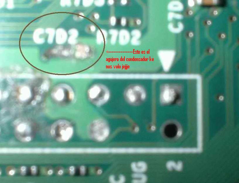 Necesitamos vuestra ayuda urgentemente poniendo el cawento puto x-bit cawento en el momento de alinearlo nos salto el condensador ke sale en la imagen ke adjuntamos bueno ke nno sale porke volo jejeje loke se ve es el agujero.