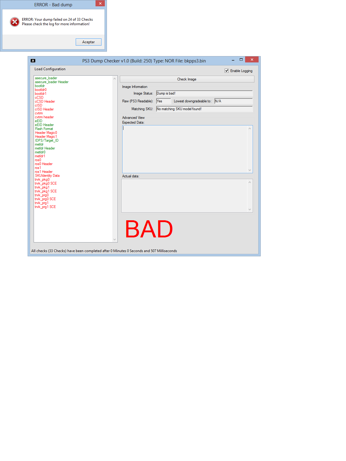 he estado extrayendo el dump de una ps3 en repetidas ocaciones con e3 flasher y siempre me da error al chekarlos ya hasta lo volví a soldar y lo mismo siempre bad blocks con ps3 Dump Checker: