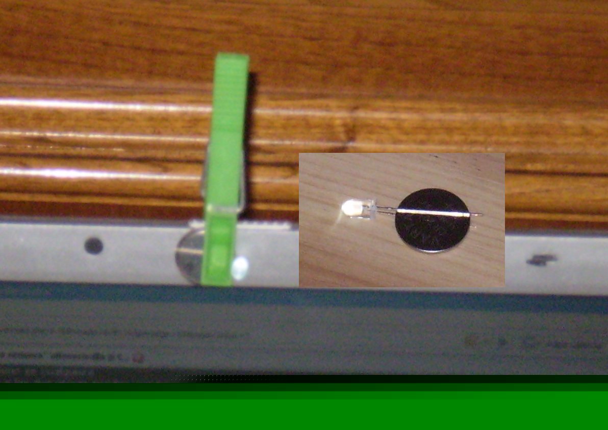 Pero para montage sencillo el que añado: pila boton + led, en su version plus se añade una pinza y se giran las patas 90º para poder engancharlo en la TFT de mi portatil (lamentablemente no tenia leds infrarrojos a mano, el lunes me hare con unos cuantos, por lo que para mostralo e usado un blanco)