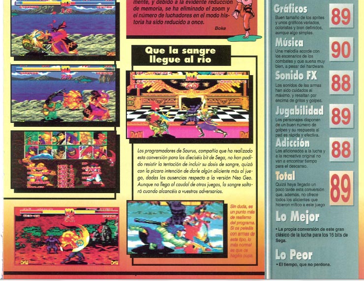 Bueno, pero es que no son solo mías esas preferencias:The Genesis version has smaller, less colorful sprites than the arcade version, though things move as quickly as they do in the arcade and the majority of move animations are intact. The Genesis has less on-screen colors overall, but uses a brighter selection that fits the style of the original game equally well. Many of the characters' animations have been changed drastically, resulting in different moves. For instance, Haohmaru's fierce slash has been changed into the same animation for his hurricane attack projectile. If you're using a three button control pad, you're stuck with an awkward control scheme where the three slashes are mapped to A, B, and C, while kicks are executed with a combination of any of these buttons. Earthquake is missing entirely here.