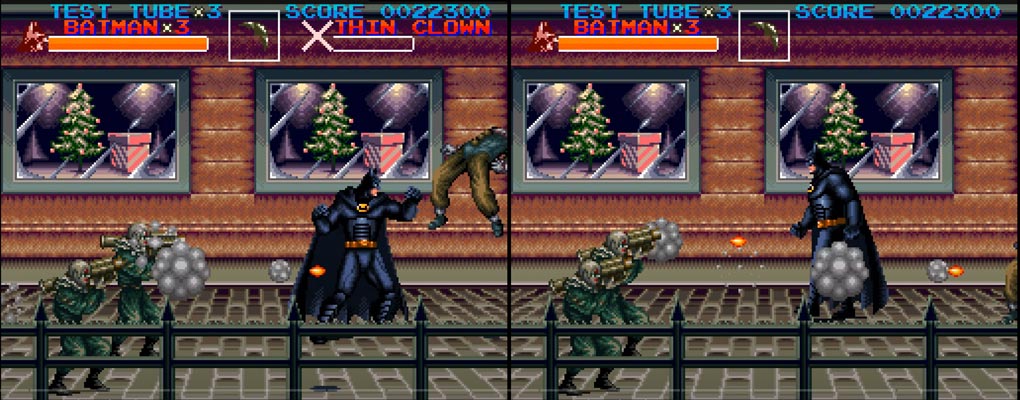 Bueno, en resumen, en SNES nunca hay más de dos modelos diferentes de enemigos en pantalla y nunca hay más de tres enemigos en pantalla. Así que no veo porque esta demo tendría que probar que es capaz de procesar sprites con un arte y diseño determinados es suficiente con procesar 2 diferentes (lo hace) y dos recoloreados (lo hace) y ser capaz de procesar sus comportamientos simulatenamente (lo hace). No se ralentiza y lo hace a mejor resolución lo que además permite meter más enemigos en pantalla y que se puedan ver. Contras: Lo de siempre peor color y sonido y el flickering que para 11 muñecos pues se hace notar demasiado, pero vamos que si puede mover 11 así, puede mover 9,8,7,6,5, etc. Todo es buscar el punto dulce equilibrado entre cero o pocos parpadeos y el mayor número de acción en pantalla y cambiar el gemelo de Batman por un Robin que igual al meter el segundo jugador diferente ahí sí hay una limitación en la variedad de enemigos permitidos porque pasaríamos de tener en la demo 3 modelos diferentes en pantalla como máximo a tener 4 y puede ser un problema. Si puede con esto también abre la puerta a que el modo de un jugador tenga tres tipos de enemigos diferentes simultáneamente lo cual estaría genial.