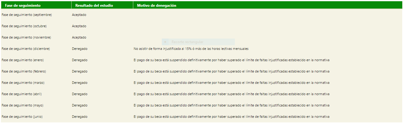 Fase de seguimiento (junio) Denegado El pago de su beca está suspendido definitivamente por haber superado el límite de faltas injustificadas establecido en la normativa