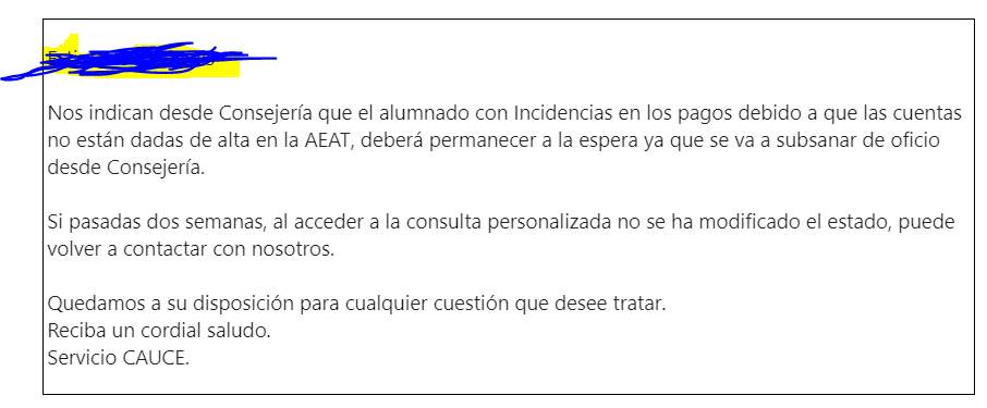 El pago de su beca no ha podido realizarse porque el NIF/NIE o la cuenta corriente indicados en la solicitud no aparecen dados de alta en el Servicio de Tesorería de la Junta de Andalucía o porque la cuenta, apareciendo, tiene fecha de caducidad y esta se ha sobrepasado. Para conocer cuales son los pasos que debe realizar para subsanar este problema, esto nos sale a tres brcantes más es normal que nos pongan esto
