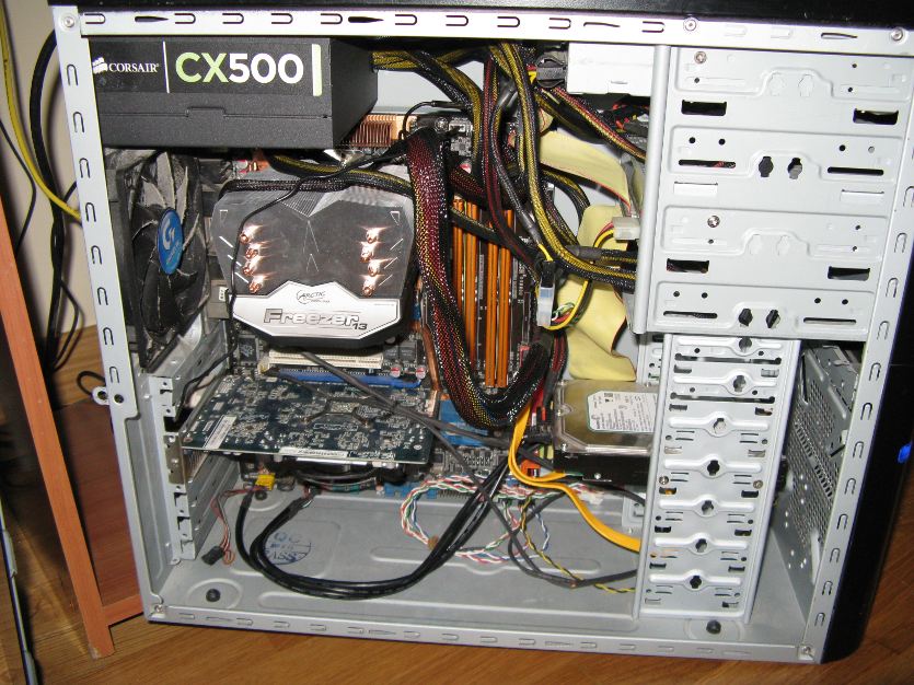 Quitando la cubierta lateral baja 10 grados, y si pongo un ventilador de esos de casa baja 30 grados, una barbaridad. Asi que definitivamente es un problema gordo de refrigeración. Tengo una caja gigabyte GZ-M2 y bueno, aquí podéis ver el lío que tengo montado: