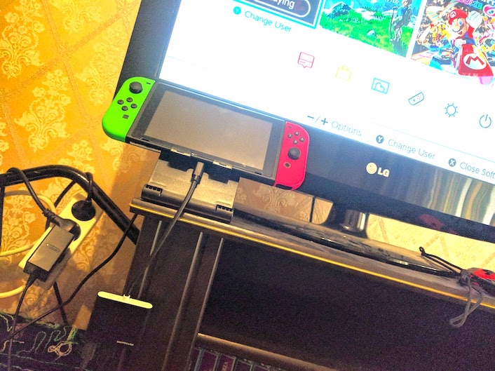 En la foto... Mi switch de 4 colores (que viva el color!!!), una LG vieja pero que todavía funciona bien, el dock de 8 lereles de Amazon (tiene para poner la switch más o menos tumbada), el conector con salida HDMI y puerto USB + USB C de Aliexpress y el cargador original de mi switch, aparte de un horroroso vestidor con una tela del año la polca y un triple de los que da miedo mirar