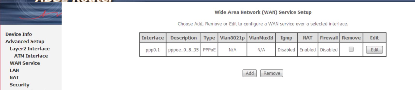 Hecho el Backup, vamos a Advanced setup-> Wan Service, y vemos que viene un Interface de fábrica, que es el que da por culo, porque tiene el firewall activado.
