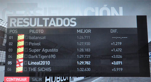 Me mantuve en esa posicion un par de vueltas hasta que alguien (no recuerdo quien) me enchufo por atrás en la entrada a la recta de atras y me mando fuera de la pista casi empotrado contra el muro, asi que entre dar marcha atrás y tal último....