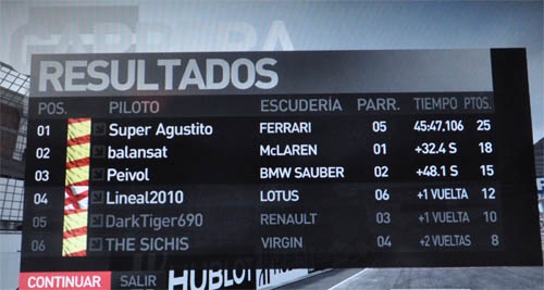 [code]Bueno, carrera totalmente desastrosa a causa de lo que pasa siempre. La gente podrá criticar de que me quejo mucho quedando arriba en la tabla, pero que te hagan hacer 7 trompos en las 4 primeras vueltas y te jodan la carrera es para quejarse. Si alguien va a adelantar a otra persona, esta que no le eche fuera de la pista por favor.