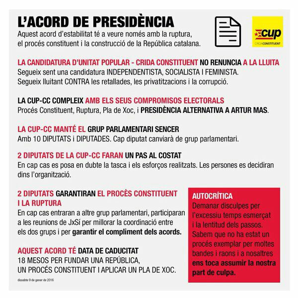 Hemos cerrado la negociación. Ni Mas ni Marzo. Tenemos nuevo presidente y la legislatura ha empezado. La CUP-CC en esta etapa que empieza será como siempre el acelerador del proceso y el freno de todas las políticas que pretendan continuar agrediendo, a golpe de tijeretazo, el conjunto de las clases populares. Lo serán nuestras diez diputadas en el parlamento y lo seremos el resto desde cada lucha, desde cada pueblo, desde cada barrio de los Países Catalanes.