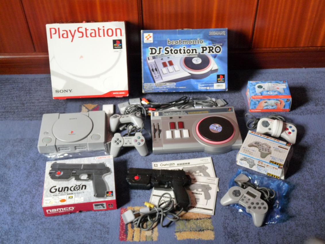 PSX japonesa con el accesorio de Beatmania , la GunCon Jp, el NegCon ( me gusta con el Wipeout, con los de coches no me convence....) y un mando programable.