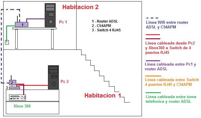 a ver si podeis ayudarme... tengo un C54APM, un punto de acceso wifi, y un switch de 4 puertos LAN, un pc una x360 y una ps3 que quiero conectar al switch y tener internet a treves de C54APM conectado mediante wifi a mi router que esta en el piso superior...