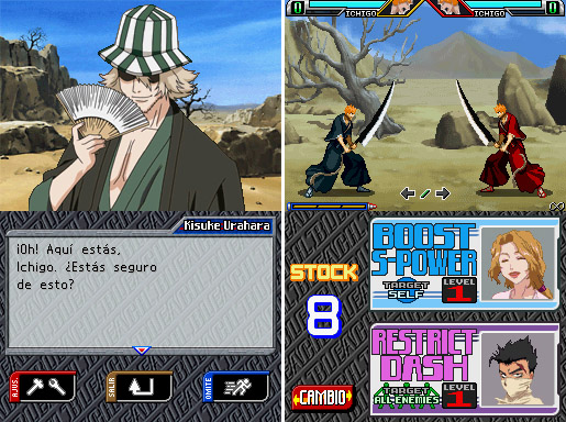 Adjunto debajo unas capturas del juego de Bleach para que se vea mejor lo que quiero hacer (en una sola pantalla, claro, porque no sería para la NDS sino para PC y smartphones, si puede ser. He puesto ese ejemplo porque es el mejor que se me ocurre).