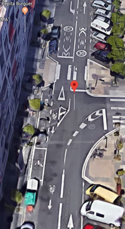 Hay un tramo también aquí que es muy gracioso: tenemos una avenida de 2 carriles en cada sentido + 1 carril de servicio en cada sentido y a alguien se le ocurrió que era buena idea pintar el carril bici en el puñetero CENTRO del carril de servicio, por lo que, como el ciclista pasa a tener todo el derecho del mundo para circular por el centro de la calzada (obviamente, es un carril para ellos), el tráfico se ralentiza si algún usuario lo utiliza. Es cierto que no es la avenida principal, pero es lo que estamos hablando, querer meter el carril bici por huevos.