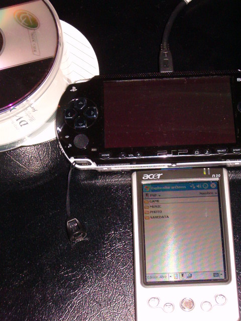 Pues aunque parece un juego de palabras,probando probando he conectado la psp a mi pda,acer n30 este tiene un cable usb y me la reconoce como disco duro y direis y para q quieres hacer esa pollada,pues muy sencillo de momento he consegido pasar canciones del pda a la psp y viceversa,asi como imagenes y savegames aparte de pelis con lo cual,es como si llevara 1 giga y medio de datos,cosa muy util cuando te vas de viaje por ejemplo,amen de mas cosas q yo creo q se podra hacer,cuestion de probar