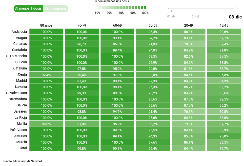 Datos generales por edades en España de personas con una dosis a 15 de noviembre: https://www.eldiario.es/sociedad/vacuna ... 82953.html