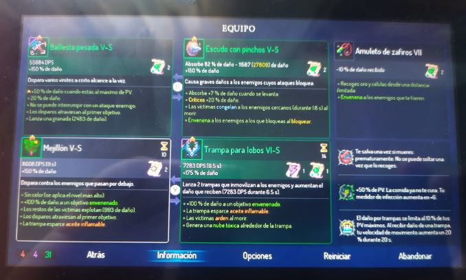 Tambien son muy importante las sinergias. Las caracteristicas de las armas son esenciales, ya que puedes practicamente duplicar el daño que hagas si lo llevas todo correctamente. Llevar una trampa como la del lanzallamas, que ademas cree una nube toxica, y llevar el resto de armas con aumento de daño si los enemigos estan envenenados y quemados es impresionante. O llevar arcos que atraviesen a los enemigos o escudos que pongan efectos de estado o tripliquen el daño que hagas despues de bloquear. Hay muchas habilidades interesantes.