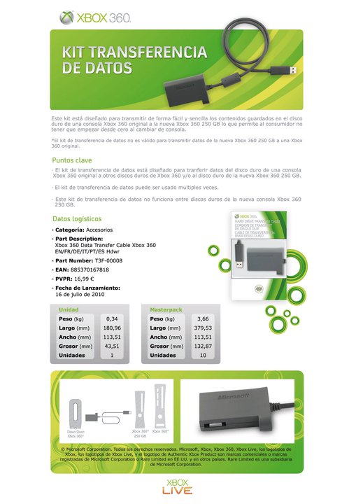 Información y detalles Kit de Transferencia de Datos Xbox 360 250GB