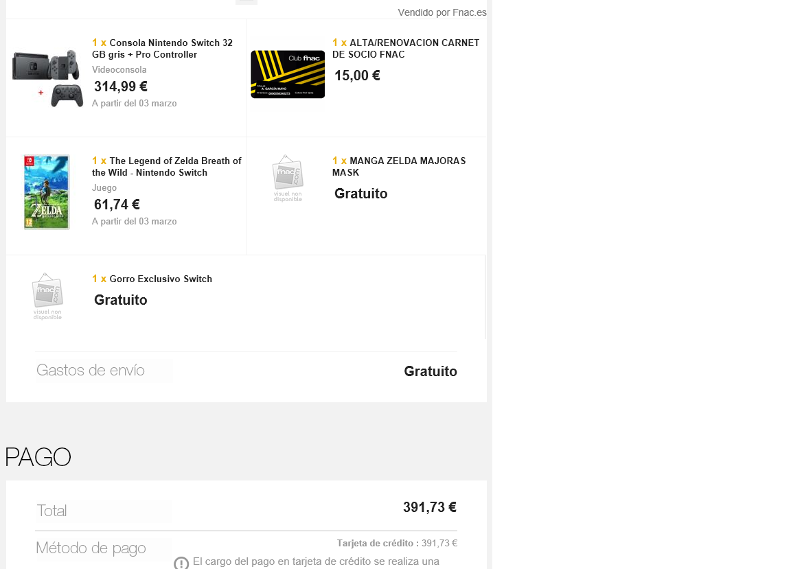 Enhorabuena a los que confiáis en estas súper ofertas, pero yo sigo creyendo que nadie regala duros a 4 pts, 330 con la tarjeta de socio la switch y el mando no hay margen de beneficio para fnac, a mi huele una manera de hacer socios, si no no hubieran metido la tarjeta a la fuerza, pero que bueno, mucha suerte a los que pagaron con tarjeta y a los que confíen hacer una transferencia, yo si os soy sincero hubiera dejado pasar la oferta