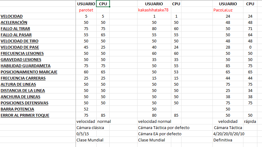 Ahora llevo ya unos partidos con resultados muy realistas y con el ritmo de juego más pausado, sin apenas tocar más que unos pocos parámetros y siempre con los mismos valores para usuario y CPU, la dificultad ya la modifico eligiendo el nivel más apropiado y la velocidad general del partido con el selector de velocidad. Voy a probar un par de cosas más y luego los pongo, pues tocando 4 cosas de nada, me está gustando la jugabilidad y con resultados reales. Saludos.