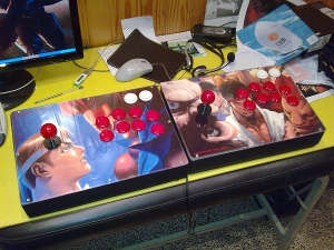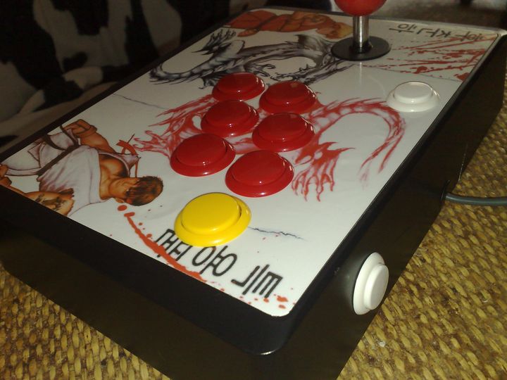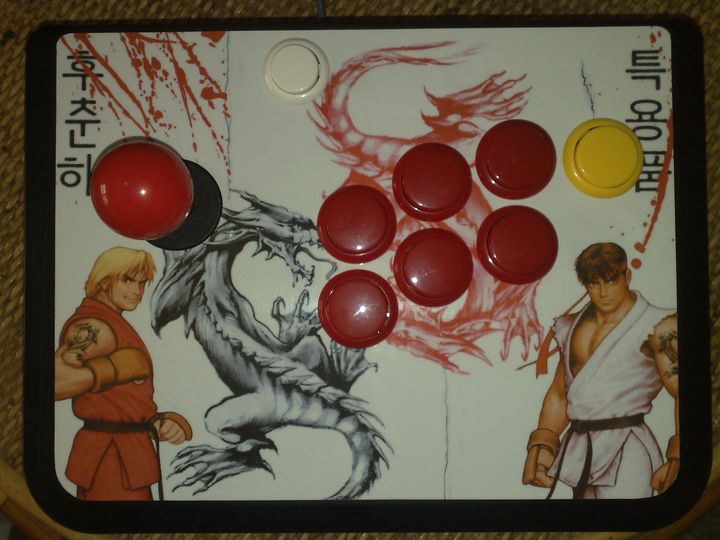 Estoy con mifune, shampy he probado tu alineación y es verdad que te obliga a jugar con la muñeca en angulo recto a ti, lo que es muy incomodo, porque si acercas la mano al stick naturalmente los dedos quedan apuntando a las once como bien dice mifunene, pero gracias por la critica, por ejempo lo de los botones transparentes para el proximo casi seguro que entran. mifune el tuyo esta muy guapo, que te parece el arte del mio? le he tapado un boton de los gatillos porque me parecia muy cargado ocho botones para lo pequña que es la caja del mayflash asi para el ultracombo depende de qe personaje pues cambio a puñetazos o patadas, y asi tambien no le tapa la cara ryu y queda mejor el dibujo. gracias