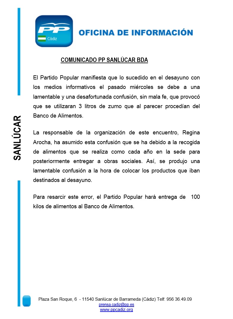 COMUNICADO PP SANLÚCAR BDA El Partido Popular manifiesta que lo sucedido en el desayuno con los medios informativos el pasado miércoles se debe a una lamentable y una desafortunada confusión, sin mala fe, que provocó que se utilizaran 3 litros de zumo que al parecer procedían del Banco de Alimentos. La responsable de la organización de este encuentro, Regina Arocha, ha asumido esta confusión que se ha debido a la recogida de alimentos que se realiza como cada año en la sede para posteriormente entregar a obras sociales. Así, se produjo una lamentable confusión a la hora de colocar los productos que iban destinados al desayuno. Para resarcir este error, el Partido Popular hará entrega de 100 kilos de alimentos al Banco de Alimentos.