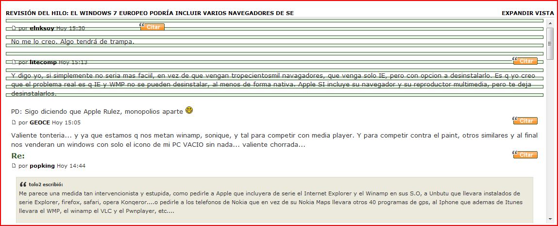 2- ¿IE es mejor que que navegadores? Si me dices que es mejor que Lynx te lo admitiré en cuanto a usabilidad, quizás también que otros vetustos... Pero no conozco un navegador gráfico moderno peor que IE, ninguno. Pero desde Windows 98 Microsoft integró el IE con el sistema operativo y consiguió así establecer otro monopolio en base al que ya tenía.anikilador_imperial escribió:Gracias al monopolio Microsoft puede hacer estas cosas,y la union europea no debe decir nada.Si Microsoft tiene el monopolio es porque los usuarios se lo han dado,y contra eso la UE no puede ni debe decir nada.