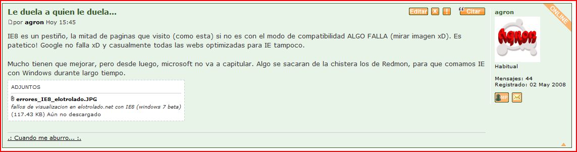 Xavy_S escribió:IE es malo, pero estan subsanandolo, lo que pasa es que si nos dejamos llevar por comentarios de 3ros y no lo probamos, pues vamos bien...