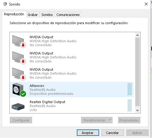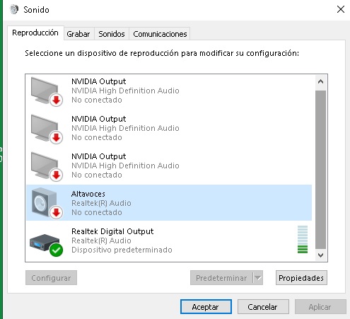 Está como dispositivo predeterminado la salida digital, haz click derecho encima de altavoces y establecer como predeterminado