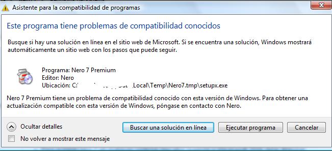Estaba intentando instalar el nero 7 y me da este error de compatibilidad con el windows vista.