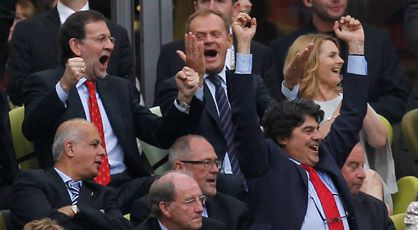 El presidente del Gobierno celebra en el palco el gol de España ante Italia. Antes de desplazarse al partido dijo que la situación tras el rescate estaba "resuelta".