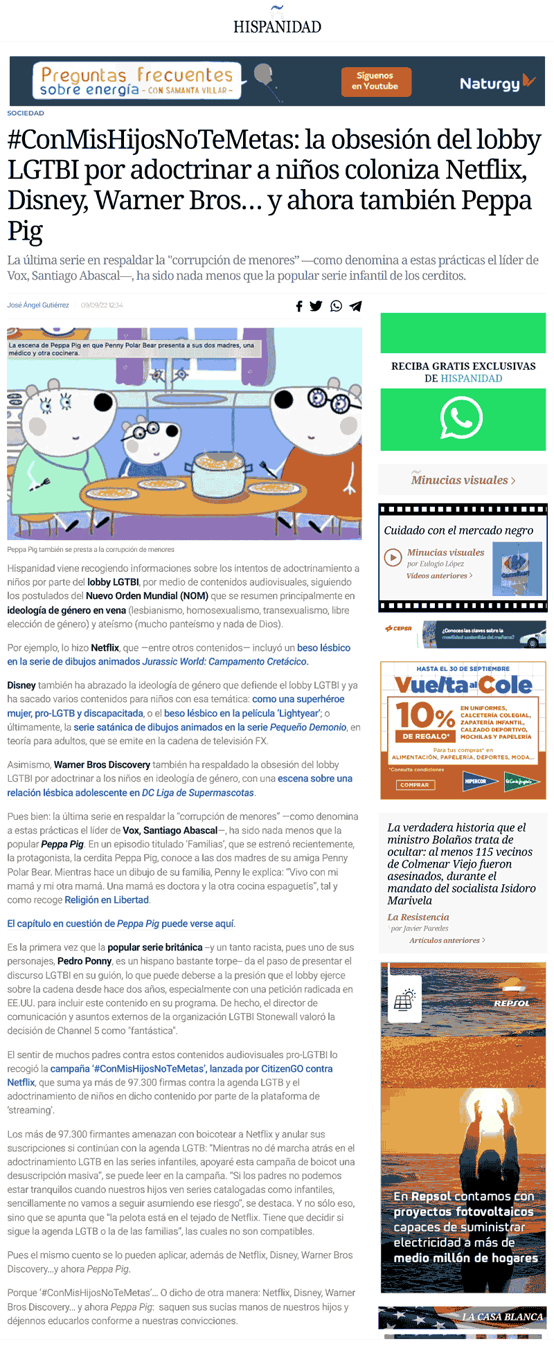 Papitxulo escribió:Tras leer la noticia sobre una polémica generada por la ultraderecha italiana por la aparición de dos personajes LGTBI+ en la serie de dibujos animados Peppa Pig, y mientras intentaba ampliar un poco la información que tenía sobre el tema, me topé con una página que ilustra perfectamente lo que a mi entender es un ejemplo de discurso de odio homófobo disfrazado de "periodismo". He puesto una captura del contenido en spoiler, porque tampoco me interesa darles más visitas (quien quiera leerlo de la fuente original, puede encontrarla fácilmente):