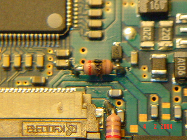 Luego tomamos las resistencias ya con sus terminales cortados y resoldados(Aplicarle un poco de soldadura a cada terminal)la tomamos con una pequeña pinza y tratamos de poner cada terminal en cada punto de soldadura a lado y lado de la pista interrumpida,ya cuando estamos seguros de que considen y de que no se unen con otros componentes adjuntos, tomamos el cautín y lo ponemos cerca al terminal de la resistencia,de modo que la soldadura que hay en las pistas de fundan con la soldadura de los terminales,cuando esto pase retiramos el cautin y esperamos 5 segundos para que la soldadura se ponga dura y soltamos la resistencia.Fijarse bien de que esto no haya probocado union entre pistas u otro componente cercano del circuito(Espero haberme hecho entender,sobre todo para los más nuevos).