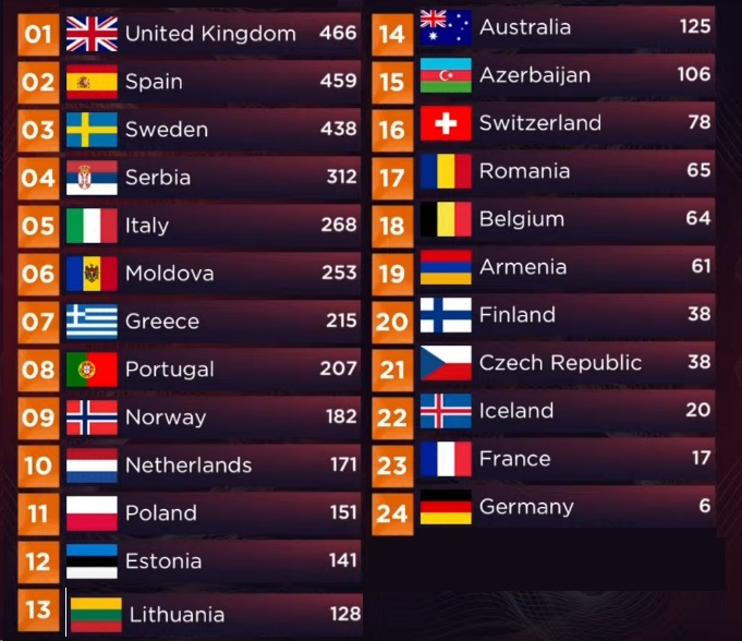 Me alegro. No por politiqueo, sino porque la canción al menos no era tan lamentable como la de UK, asi que...entre una y la otra, resultado justo, pese a que realmente haya venido por lo que ha venido.