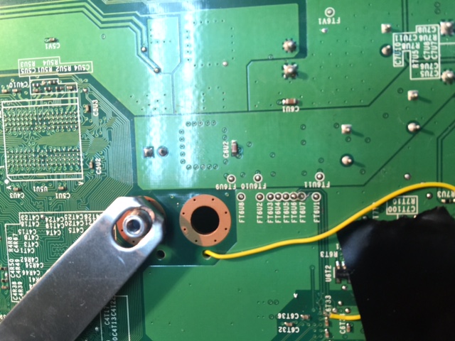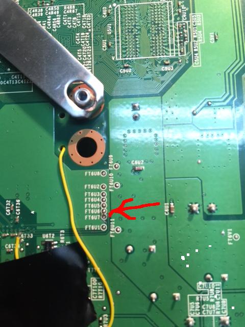 Bufff, lo tienes un poco jodido para reconstruirlo, has de seguir la pista que parte del punto FT6U7 volado por la parte inferior y veras que va hasta otro punto debajo de la CPU, es un punto que es muy dificil soldar sino tienes experiencia, el otro extremo del cable hay que soldarlo en el mismo punto FT6U7 pero por la parte de arriba.