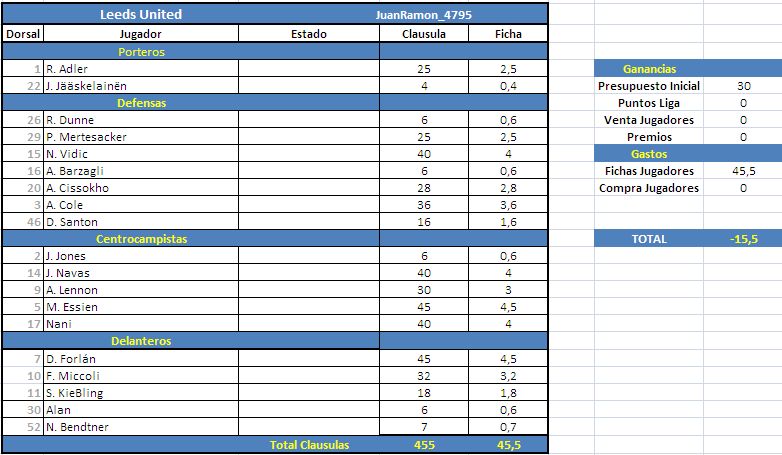 Salario jugadores: X (Acordaros que las nuevas incorporaciones solo puede variar 10 millones "arriba/abajo" de su anterior clausula, y los jugadores que mantenemos se deben quedar con la misma clausula).