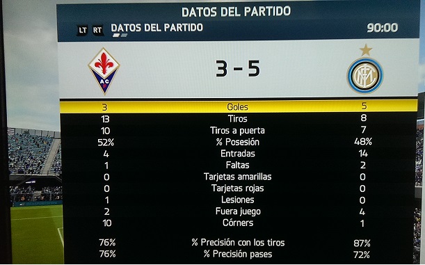 Tras salir decidido al ataque en la primera parte, y marcar tres goles, me he ido para atrás a defender el resultado, lo que casi ha supuesto mi perdición. La Fiorentina ha salido a tope en la segunda parte y ha marcado dos goles que han hecho que acabe pidiendo la hora.
