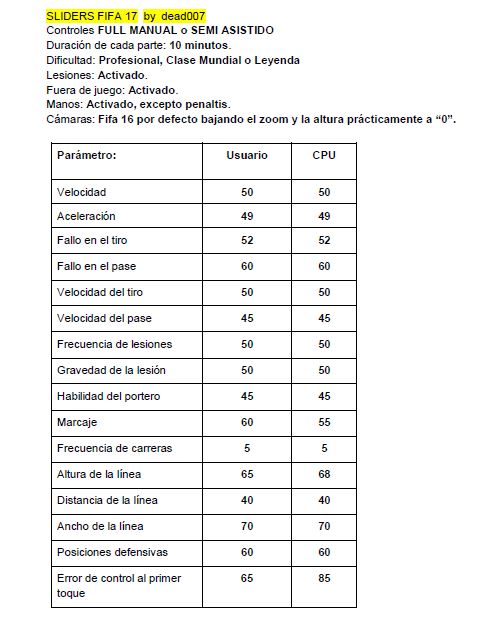 Segundo alguno os flipais con que pone un usuario y lo hacéis internacional. Los sliders es como la sal de una comida o el punto de la carne...entiendo que con mayor fallo en los pases y errores al controlar disfrutemos más casi todos, pero por ejemplo no bajo las carreras de los jugadores porque me parece una chulada de este año la movilidad que hay si me cargo eso yo no disfruto tanto...por eso creo que lo que deberia hacer cada uno es saber que le falta al juego para hacerte disfrutar más de él...y en funcion de eso retocarlo.